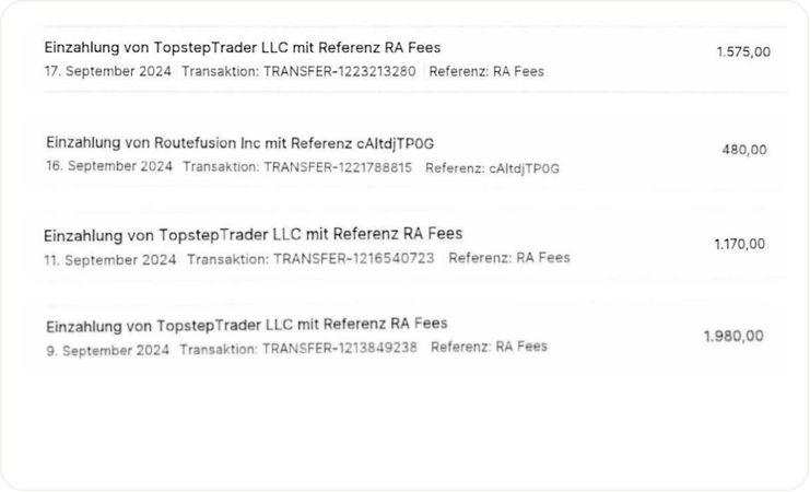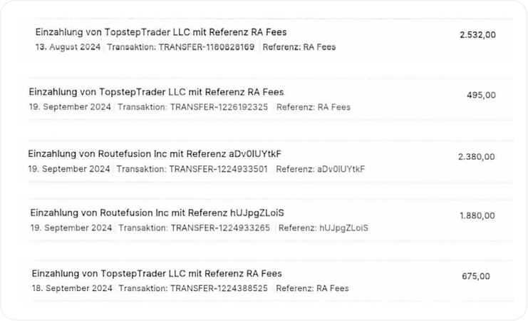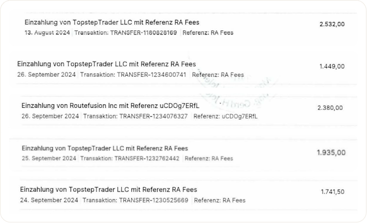 Überprüfte Auszahlungen bei mehreren Prop-Firmen – Monat für Monat nachgewiesen. Jede Auszahlung basiert auf kontrolliertem Risiko, nicht auf Zufall oder Glückstreffern.