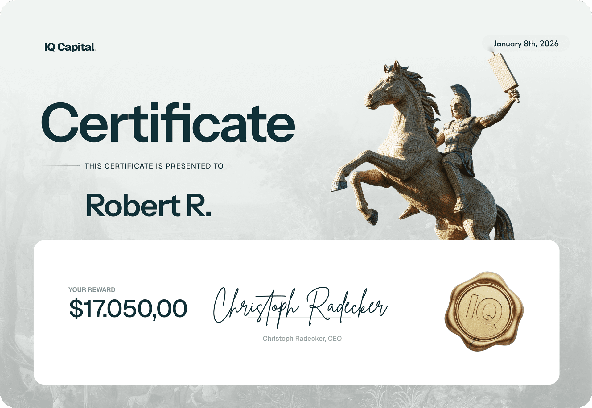 His approach works in the crypto market too — his first payout at IQ Capital: